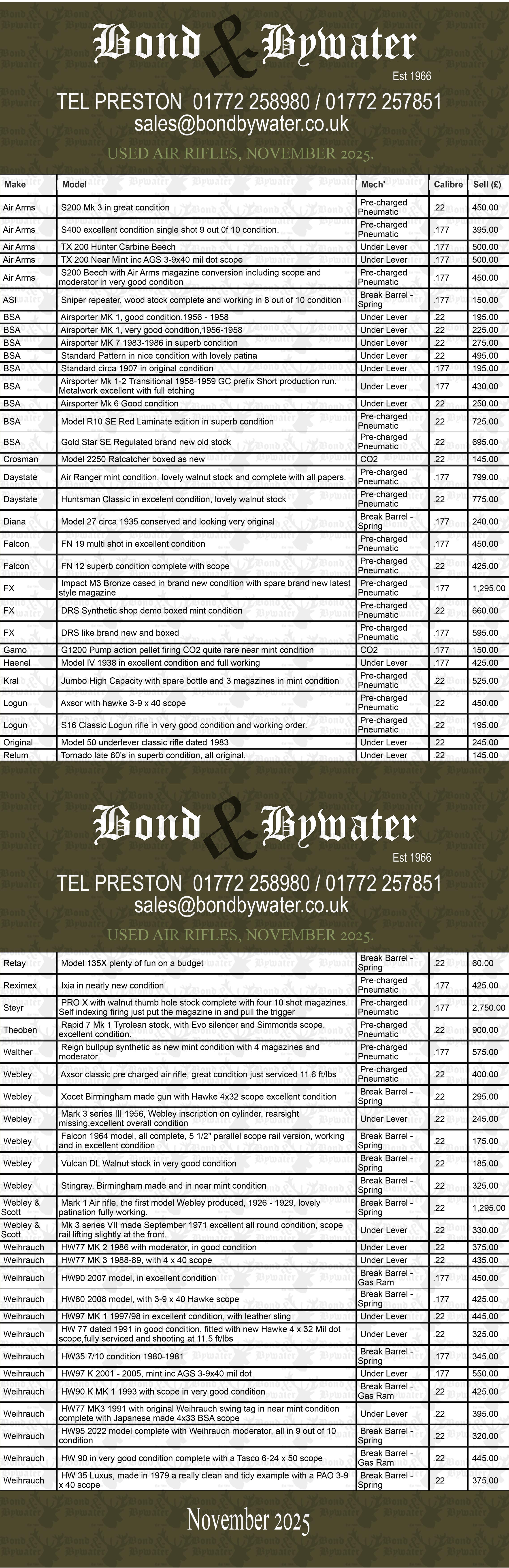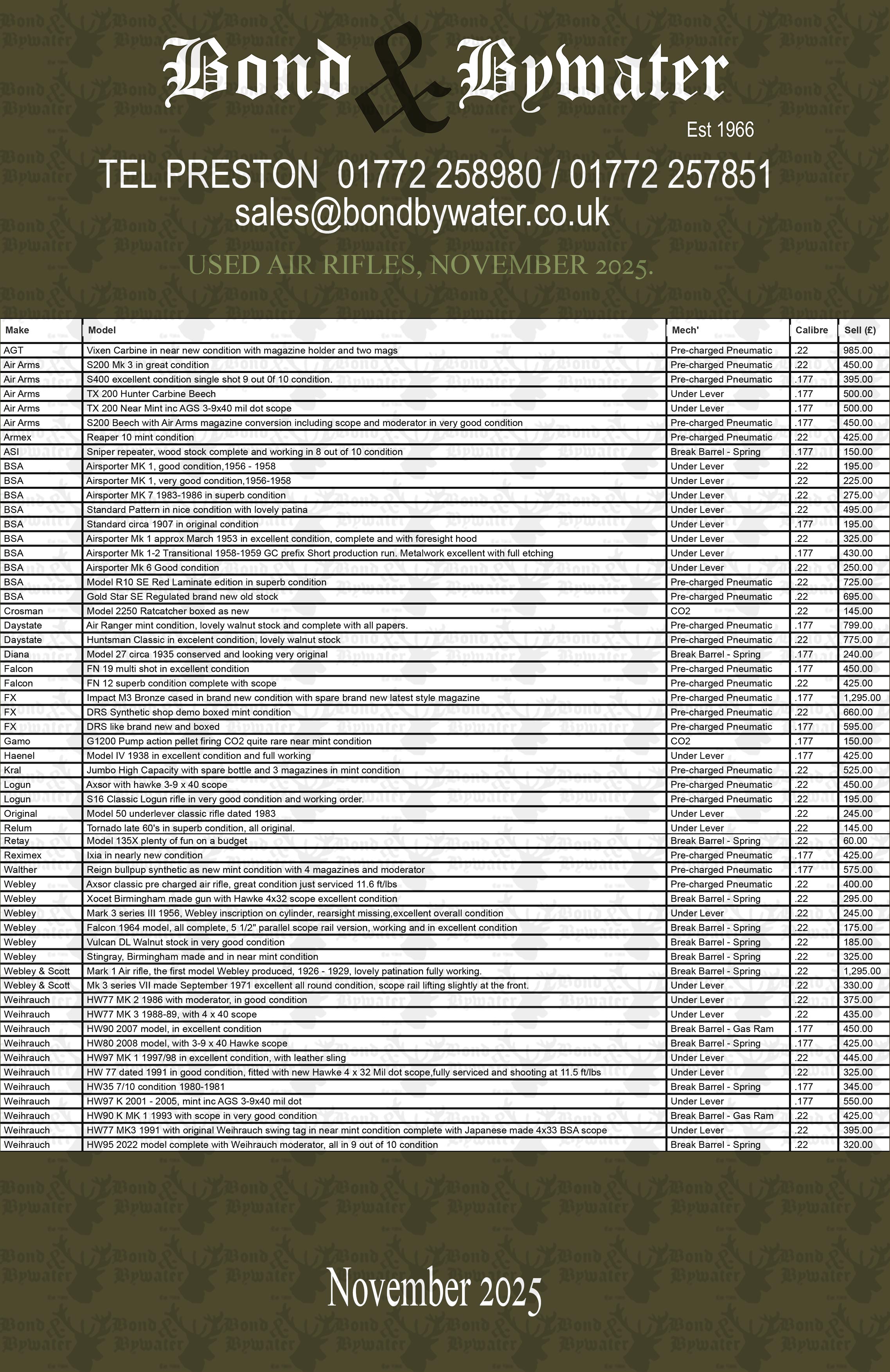 | 22/11/2025 November 2025Price list for second hand sub 12 ft/lb air rifles If you are looking for a used air rifle, we have many in stock, but we can't get them all advertised on Gun Trader due to time constraints. However the next best thing is the list which we have put a link to for a document with the current second hand air rifles we have in stock. Click here for price list Click here for a different format price list if you can't open the first one IF THERE IS ANYTHING OF INTEREST PLEASE GIVE US A CALL. Read More > | ![]() |