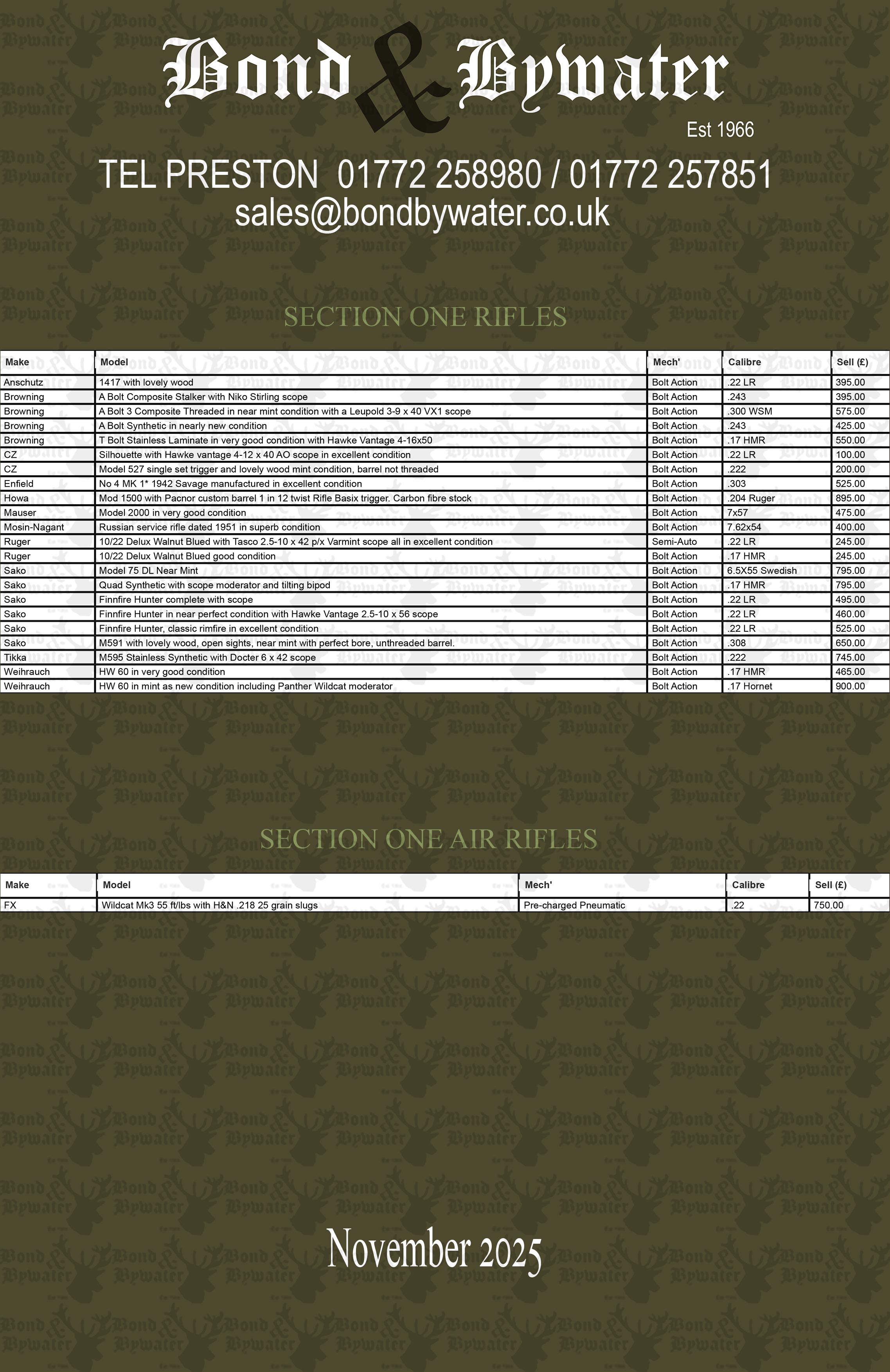 | 14/11/2025 November 2025Price list for second hand Section One rifles and air rifles Here is our Second hand Section one rifle price list for downloading. Click here for a section one rifle price list Click here for a different format price list if you can't open the first one IF THERE IS ANYTHING OF INTEREST PLEASE GIVE US A CALL. Read More > | ![]() |