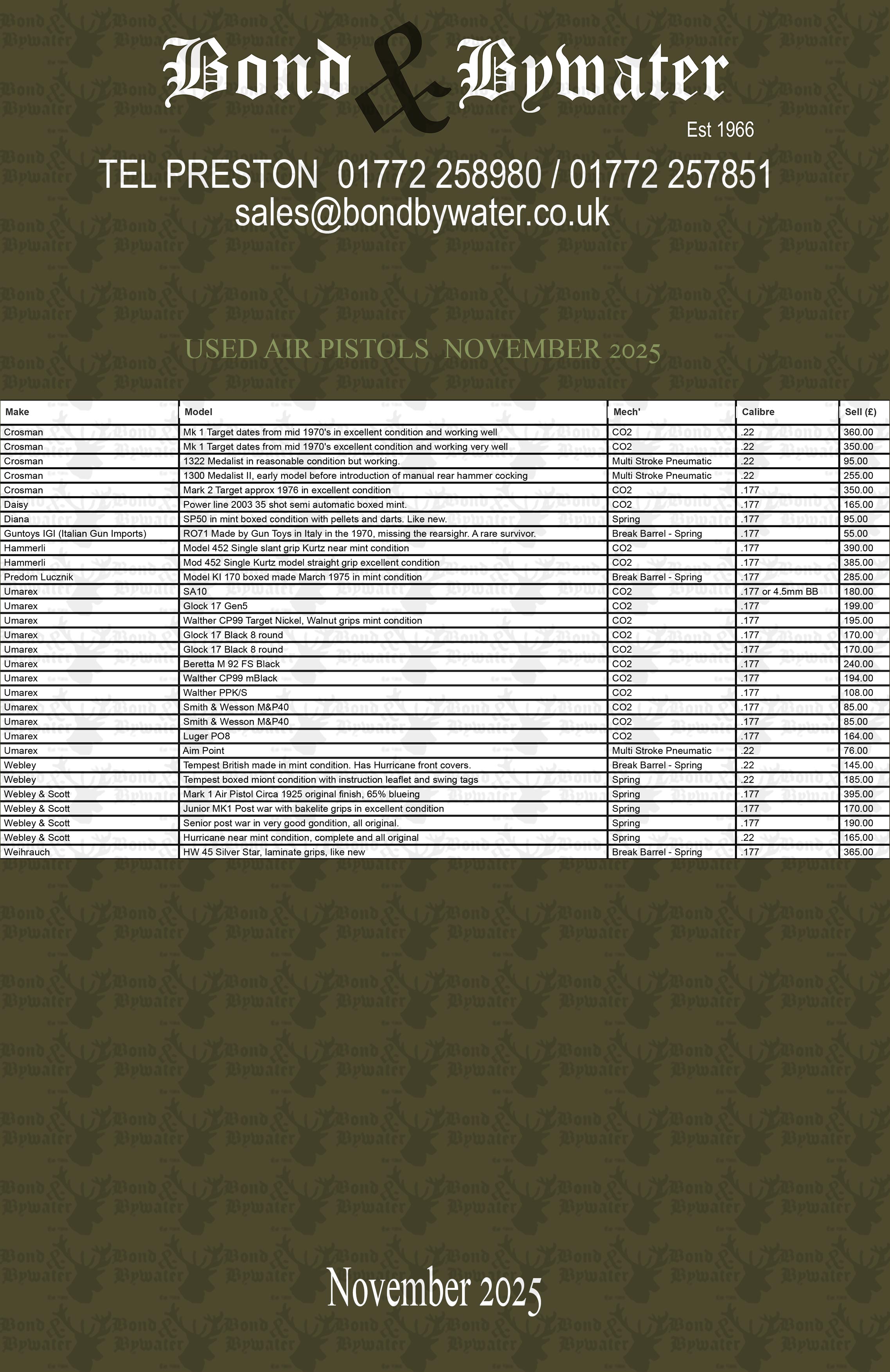 | 14/11/2025 November 2025 Price list for second hand air pistols If you are looking for a used air pistol, we have many in stock, but we can't get them all advertised on Gun Trader due to time constraints. However the next best thing is the list which we have put a link to for a document with the current second hand air rifles we have in stock. Click here for price list Click here for a different format price list if you can't open the first one IF THERE IS ANYTHING OF INTEREST PLEASE GIVE US A CALL. Read More > | ![]() |
